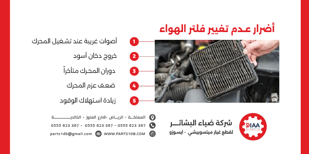 - انخفاض كفاءة المحرك: تراكم الأوساخ والجزيئات في الهواء الداخل إلى محرك سيارتك يؤدي إلى تقليل كفاءة الاحتراق، مما يؤثر على أداء المحرك.